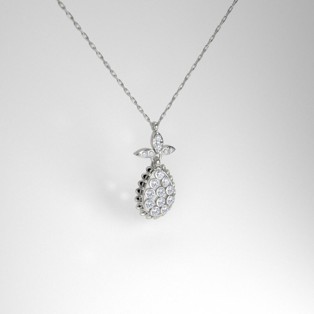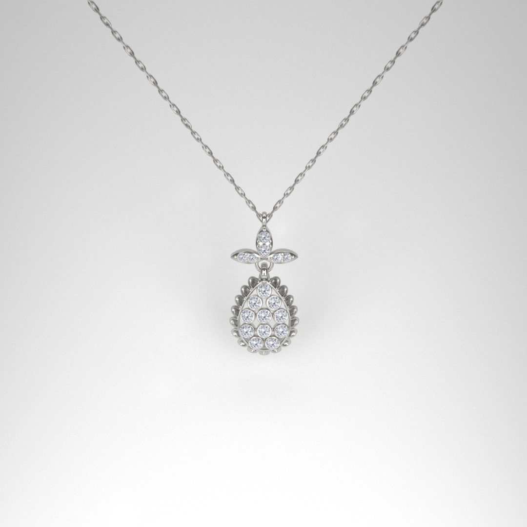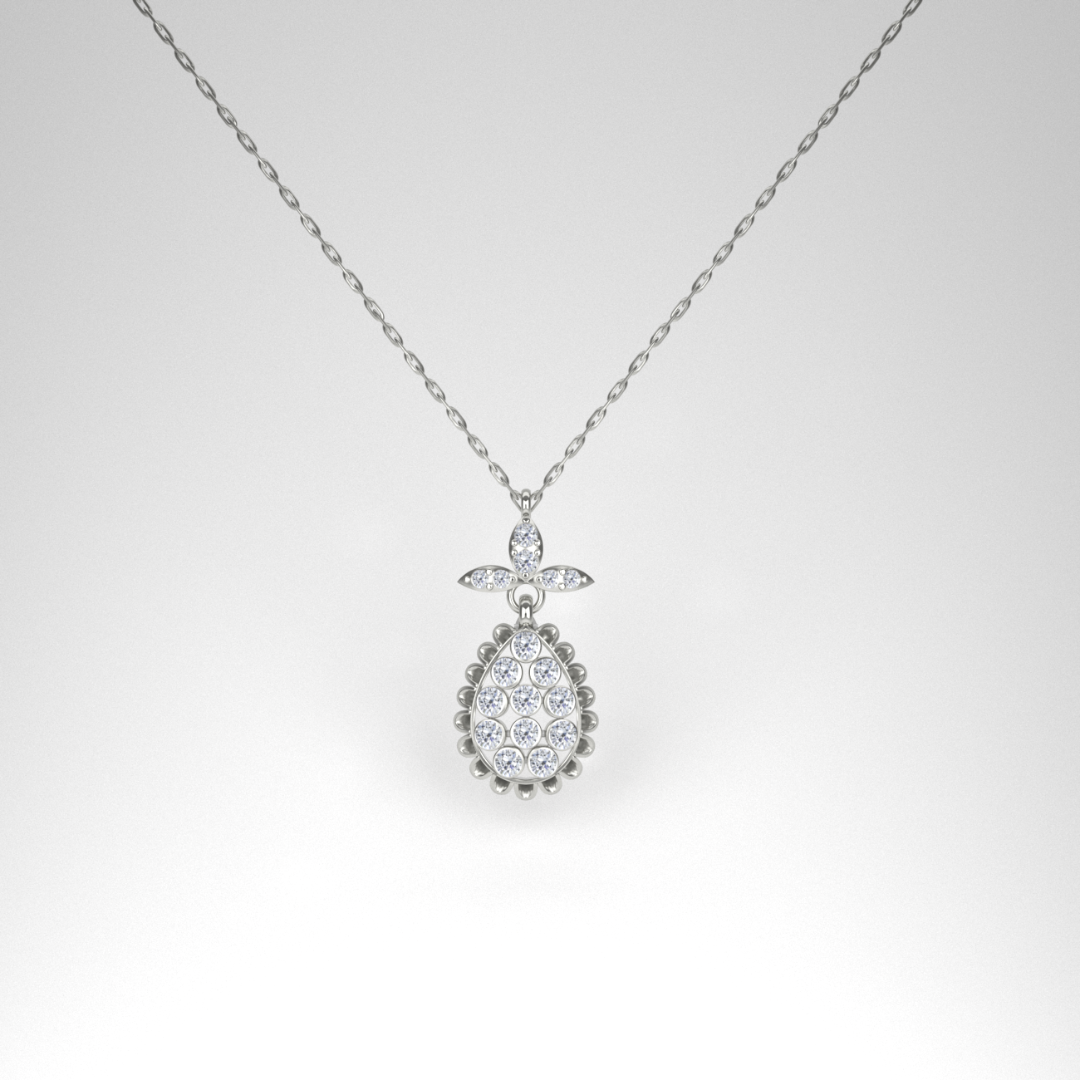 The Auralie Drop is a celebration of sophistication. Its softly rounded teardrop silhouette is framed by intricate beading and topped with a sparkling trio of marquise-cut accents, resembling a blooming floral crown. Each detail is meticulously handcrafted, ensuring every pendant is unique.