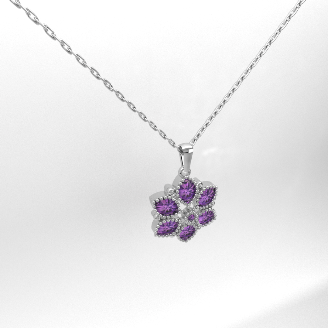 elicate yet bold, the Viola Bloom Pendant captures the vibrant essence of nature in full bloom. Handcrafted from 925 sterling silver, this pendant features a stunning floral design with rich violet-hued stones arranged in perfect harmony. A radiant symbol of beauty, creativity, and elegance, it’s made to stand out while remaining gracefully wearable.